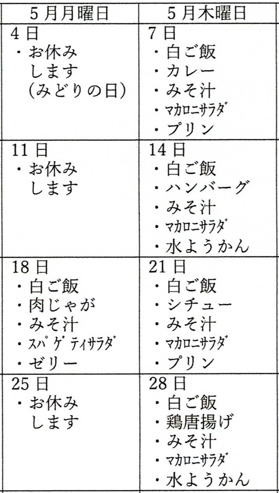 2026年5月のこども食堂メニューを上にご紹介します。