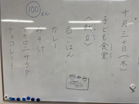 こども食堂メニュー、カレーです 皆様、こんにちは。NPO法人ウィズユきたごよう理事長です。 2025年10月30日は、白ごはん・カレー・みそ汁・マカロニサラダ・チョコレートです。 1食100円です。 皆様のお越しをお待ちしています。