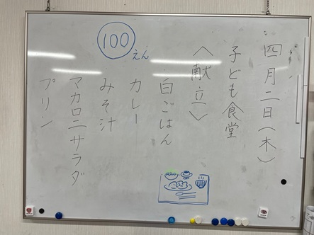 こども食堂メニュー、カレーです 皆様、こんにちは。NPO法人ウィズユきたごよう理事長です。 2026年4月2日は、白ごはん・カレー・みそ汁・マカロニサラダ・プリンです。 1食100円です。 皆様のお越しをお待ちしています。