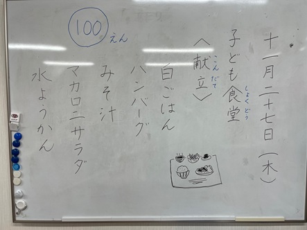 こども食堂メニュー、ハンバーグです 皆様、こんにちは。NPO法人ウィズユきたごよう理事長です。 2025年11月27日は、白ごはん・ハンバーグ・みそ汁・マカロニサラダ・水ようかん・千切りキャベツです。 1食100円です。 皆様のお越しをお待ちしています。