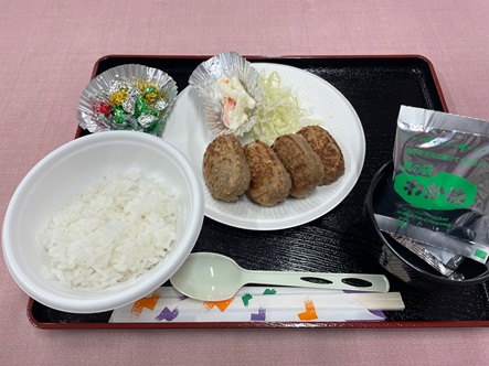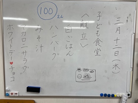 こども食堂メニュー、ハンバーグです 皆様、こんにちは。NPO法人ウィズユきたごよう理事長です。 2026年3月12日は、白ごはん・ハンバーグ・みそ汁・マカロニサラダ・ホワイトデーチョコプリン・千切りキャベツです。 1食100円です。 皆様のお越しをお待ちしています。