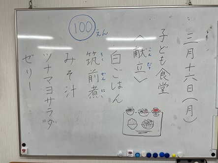 こども食堂メニュー、筑前煮です 皆様、こんにちは。NPO法人ウィズユきたごよう理事長です。 2026年3月16日は、白ごはん・筑前煮・みそ汁・ツナマヨサラダ・ゼリーです。 1食100円です。 皆様のお越しをお待ちしています。