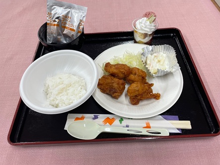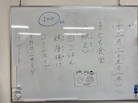 こども食堂メニュー、鶏唐揚げです 皆様、こんにちは。NPO法人ウィズユきたごよう理事長です。 2025年12月25日は、白ごはん・鶏唐揚げ(とりからあげ)・コーンスープ・マカロニサラダ・クリスマスデザート・千切りキャベツです。 1食100円です。 皆様のお越しをお待ちしています。