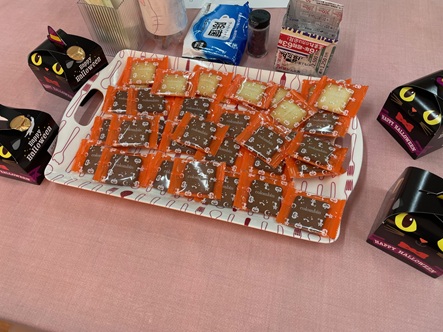 1食100円です。希望される先着36名のお子様には無料でハロウィンチョコサンドクッキーもお渡ししています。すでにたくさんのお子様が来ています。