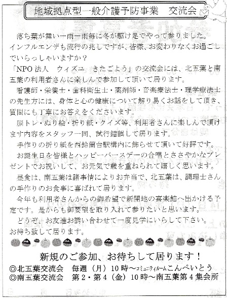 「NPO法人ウィズユきたごよう」の交流会には、北五葉と南五葉の利用者さんに楽しんで参加して頂いて居ります。