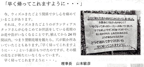 それは、ウィズユきたごようのボランティアスタッフさんが心をこめてお世話をしている花壇のお花や苗がいなくなることです。植えてから24時間以内、つまり翌朝花壇を観たら、穴が数か所あいていたこともあります。「早く帰ってこれますように・・・」という表示もつけたのですが、その横の花などが新たにいなくなっています。