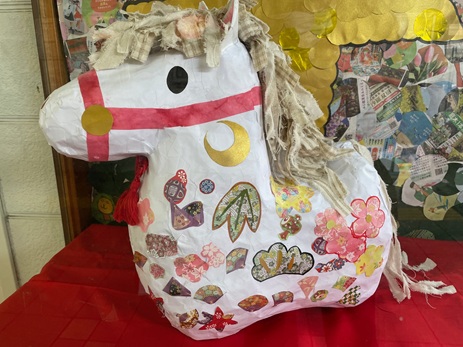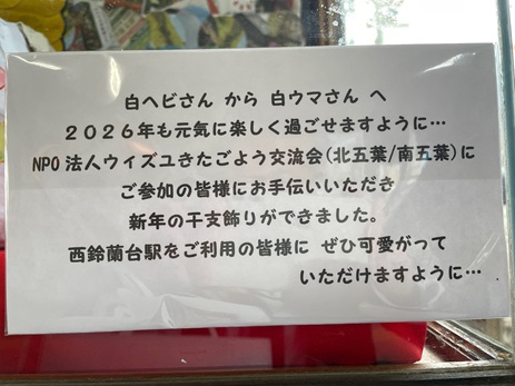 白ヘビさんから白ウマさんへ 2026年も元気に楽しく過ごせますように…。NPO法人ウィズユきたごよう交流会(北五葉/南五葉)にご参加の皆様にお手伝いいただき新年の干支飾りができました。西鈴蘭台駅をご利用の皆様に、ぜひ可愛がっていただけますように…。