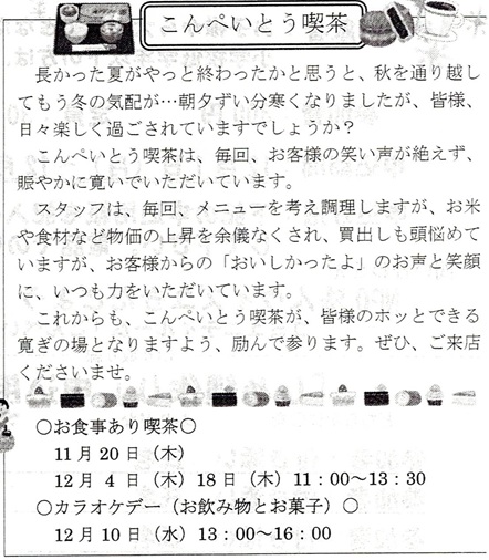 こんぺいとう喫茶は、毎回、お客様の笑い声が絶えず、賑やかに寛いでいただいています。